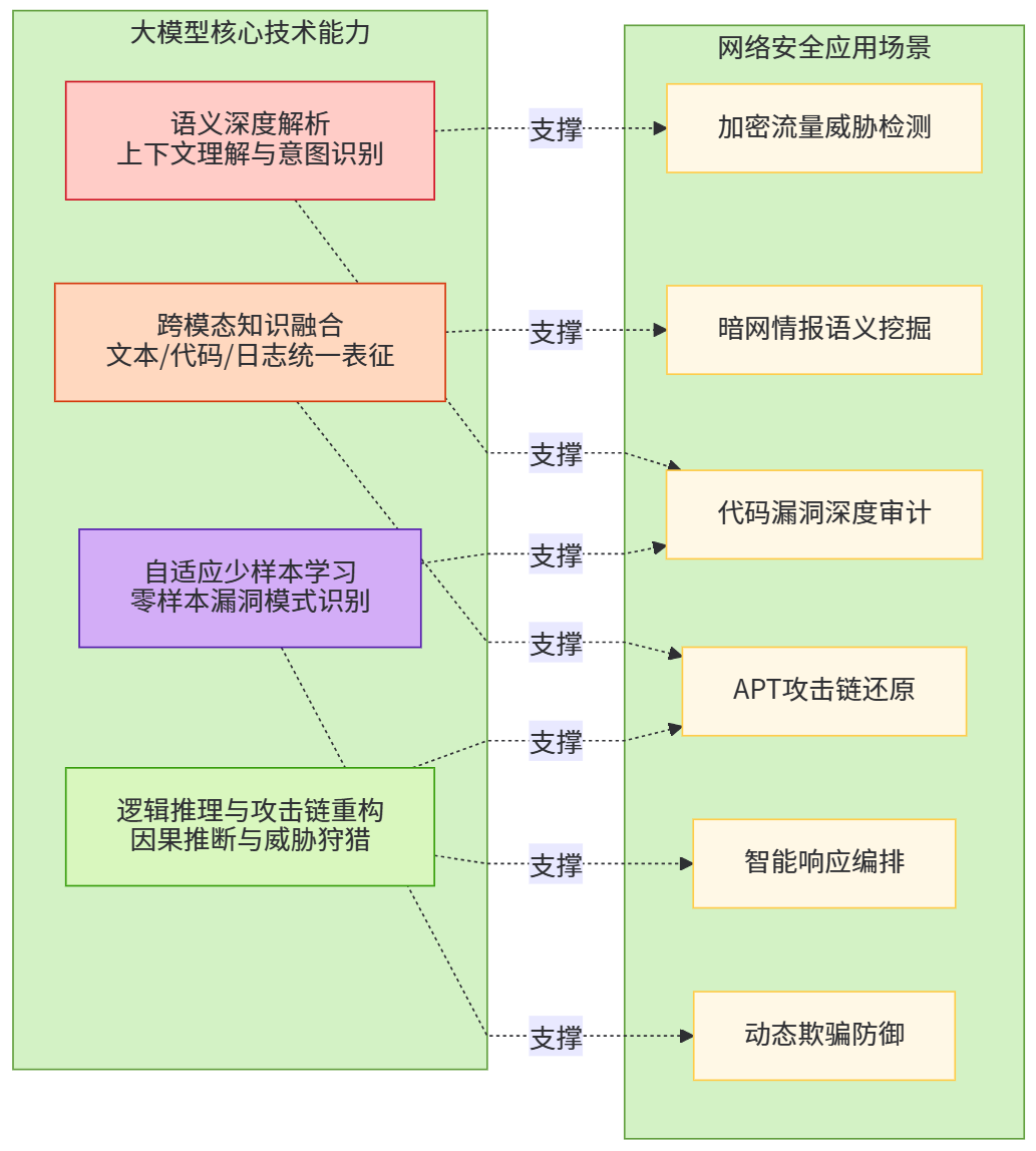 大模型对网络安全的影响根源在于其技术本质的根本性跃迁。传统机器学习模型,无论是用于恶意软件检测的随机森林,还是用于异常流量识别的孤立森林算法,本质上属于判别式模型,其功能边界局限于特征空间中的分类与聚类任务。这些模型依赖精心设计的特征工程,对未知模式的泛化能力受限,且缺乏对任务本质的"理解"。大模型则通过千亿级参数的规模效应与海量多模态数据的预训练,展现出涌现的智能特性:上下文理解、逻辑推理、知识泛化与创造性生成。这种从判别到生成、从感知到认知的跨越,使其能够处理传统AI无法胜任的复杂安全任务。