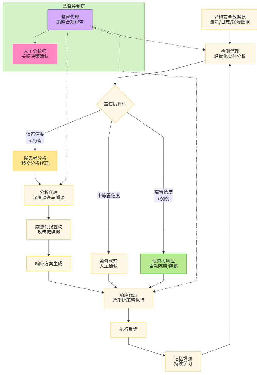 检测代理 负责实时数据摄取与初步威胁识别,部署于网络边缘节点,采用轻量化模型实现低延迟检测。其输出不是简单告警,而是包含置信度、特征向量与上下文摘要的"威胁向量"。分析代理 接收威胁向量,执行深度调查。它可调用沙箱动态分析样本、查询历史攻击知识库、模拟攻击者下一步行动,生成包含技术细节与影响评估的分析报告。响应代理 根据分析结果执行具体动作,具备跨平台操作能力。通过理解设备API文档与GUI界面,它可向防火墙下发规则、修改EDR策略、触发补丁管理系统,甚至通过"类人点击"操作无API的传统系统。监督代理 作为元控制器,监控各代理行为,确保策略合规性,并在关键决策点引入人工确认。这种架构实现了能力分层与责任隔离,既保证了响应速度,又控制了自主决策风险。