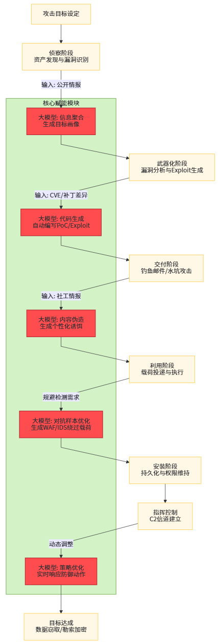 大模型为攻击方提供的不仅是效率工具,更是攻击方法论的重构能力。传统网络攻击遵循"侦察-武器化-交付-利用-安装-指挥控制-行动"的Kill Chain模型,各环节依赖人工操作与预设工具,攻击规模与复杂度受限于攻击者的技术能力与时间投入。大模型驱动的自主攻击代理(Autonomous Cyber Agents)正在打破这一限制,展现出前所未有的智能化水平。
