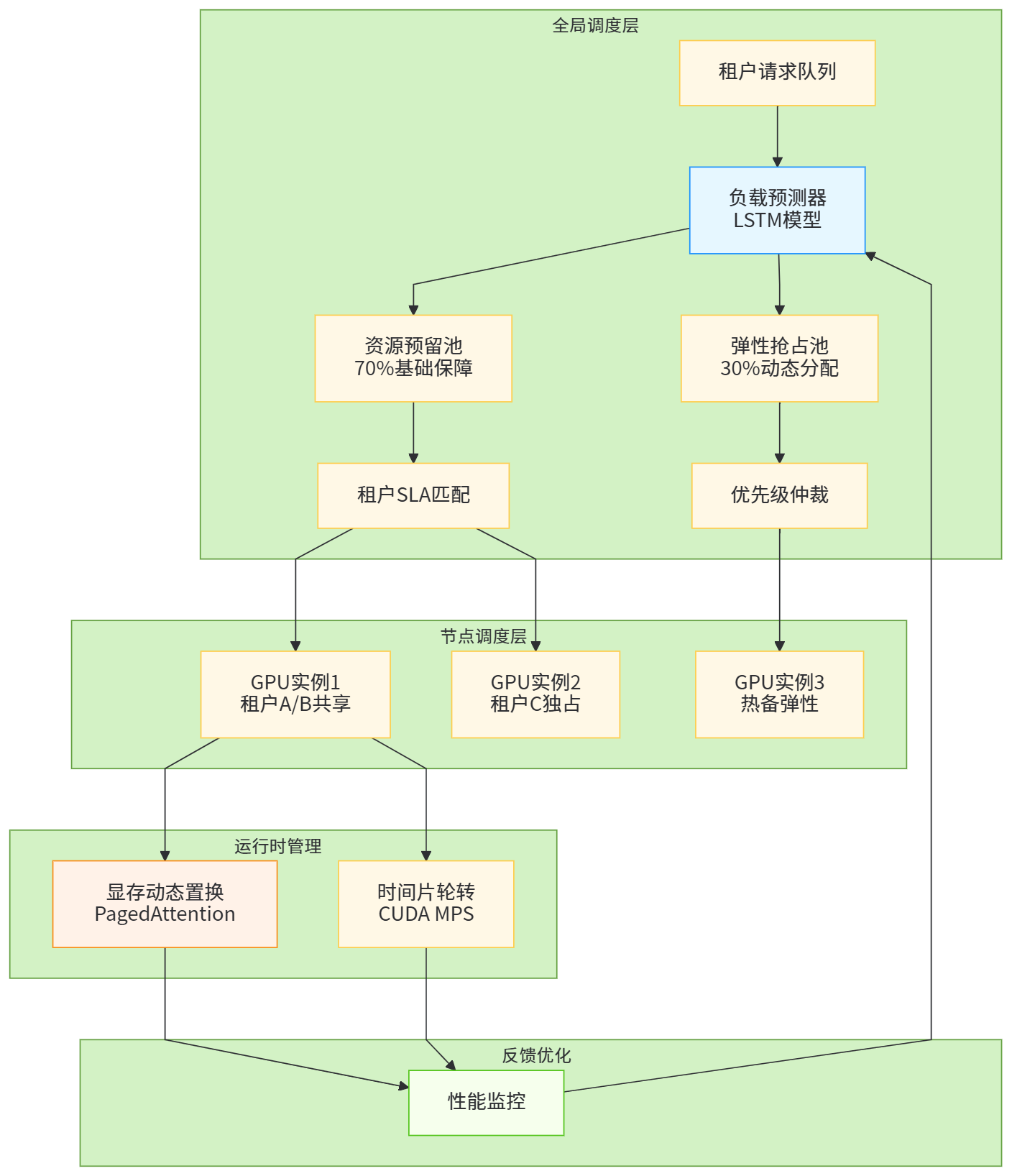 在高并发多租户场景下,资源分配面临公平性、效率与延迟的不可能三角。追求公平性意味着严格按租户配额分配资源,但这会导致资源碎片化和整体效率下降;追求效率则要求全局资源池化与动态抢占,却可能引发资源饥饿与请求延迟抖动;追求低延迟需要资源预留与热点缓存,却又与多租户共享的初衷相悖。现代架构通过分层调度器设计破解这一困境:在全局层采用基于历史负载预测的预留+抢占混合策略,为每个租户分配基础预留资源保障服务等级协议(SLA),同时维护30%的弹性资源池供高优先级请求抢占;在节点层实施GPU时间片轮转与显存动态置换,通过CUDA MPS(Multi-Process Service)技术实现毫秒级的任务切换,将上下文切换开销控制在5%以内。更前沿的实践引入了强化学习调度器,将租户的资源请求视为马尔可夫决策过程,通过持续学习不同业务模式的资源消耗特征,实现预测性调度。例如,针对电商租户的秒杀场景,调度器会提前30秒预热GPU资源并缓存热点模型;而对企业内部门户的低频咨询,则采用冷启动+按需加载策略,将资源消耗压缩至最低。这种动态权衡机制使整体资源利用率提升40%的同时,将P99延迟从800ms降至200ms以内。