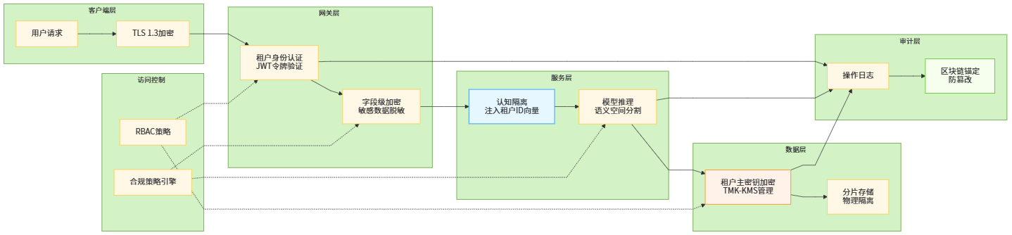 | 认知隔离 | 模型层语义分割 | 85%-95% | 逻辑隔离 | 毫秒级 | AI原生对话平台 | 模型改造复杂,需定制架构 |