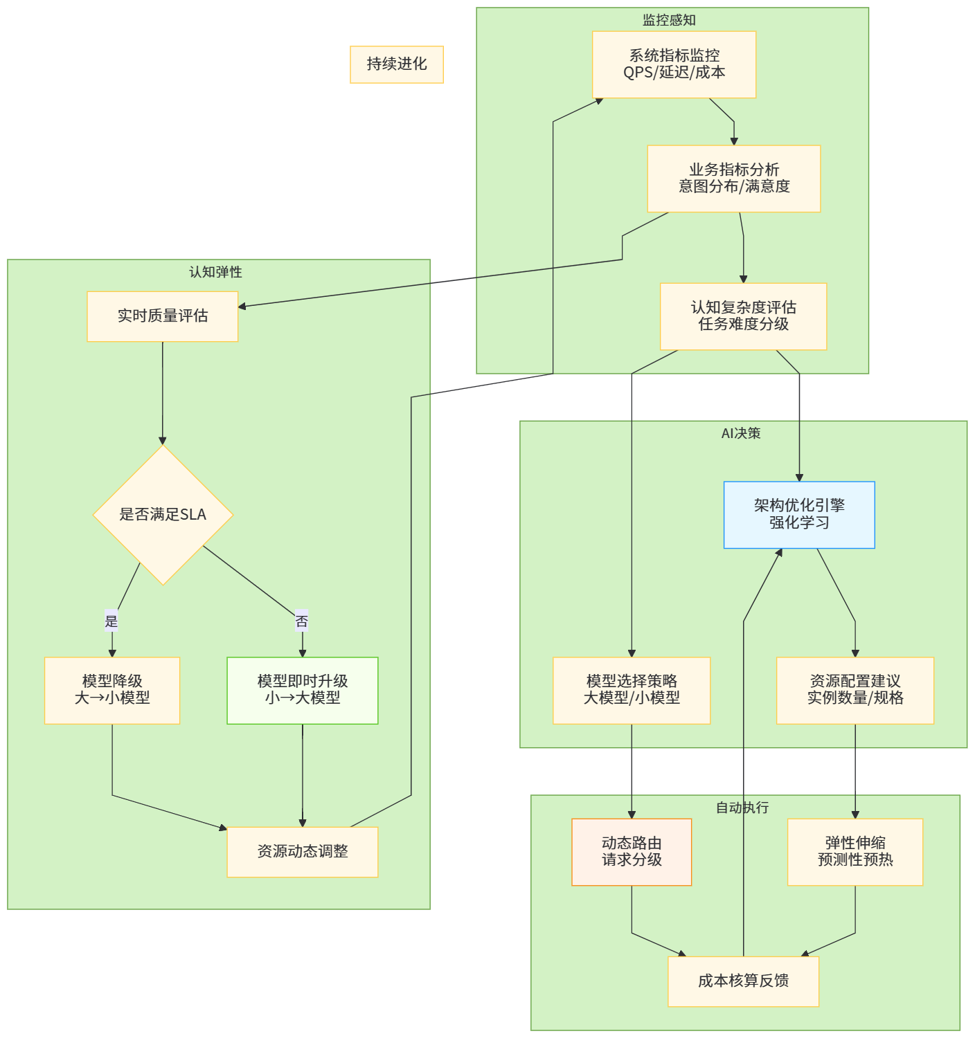 当大模型能力从对话生成延伸至系统运维,AI开始自主优化架构。AI架构师通过分析历史监控数据,自动生成资源配置建议。例如,发现某租户在每周一上午9点流量激增3倍,AI自动创建CronJob在8:30预热资源,并在10:00后释放,实现无人值守的弹性伸缩。更深层的优化是架构自进化:AI通过强化学习探索新的调度策略,如发现现有负载均衡算法在某些租户组合下效率低下,自动提出改进方案并A/B测试,验证有效后合并至主干。Meta的Hammer系统已实现部分自优化能力,使集群资源效率提升18%。对话机器人架构的终局可能是认知弹性架构:系统不仅根据负载伸缩,更根据对话内容的认知复杂度动态调整——简单FAQ路由至小模型,深度咨询调用大模型,且在对话过程中实时切换,实现资源消耗与任务难度的最佳匹配。这种架构需要模型具备自我评估能力,能实时判断当前生成质量是否满足需求,从而触发模型升级或降级。