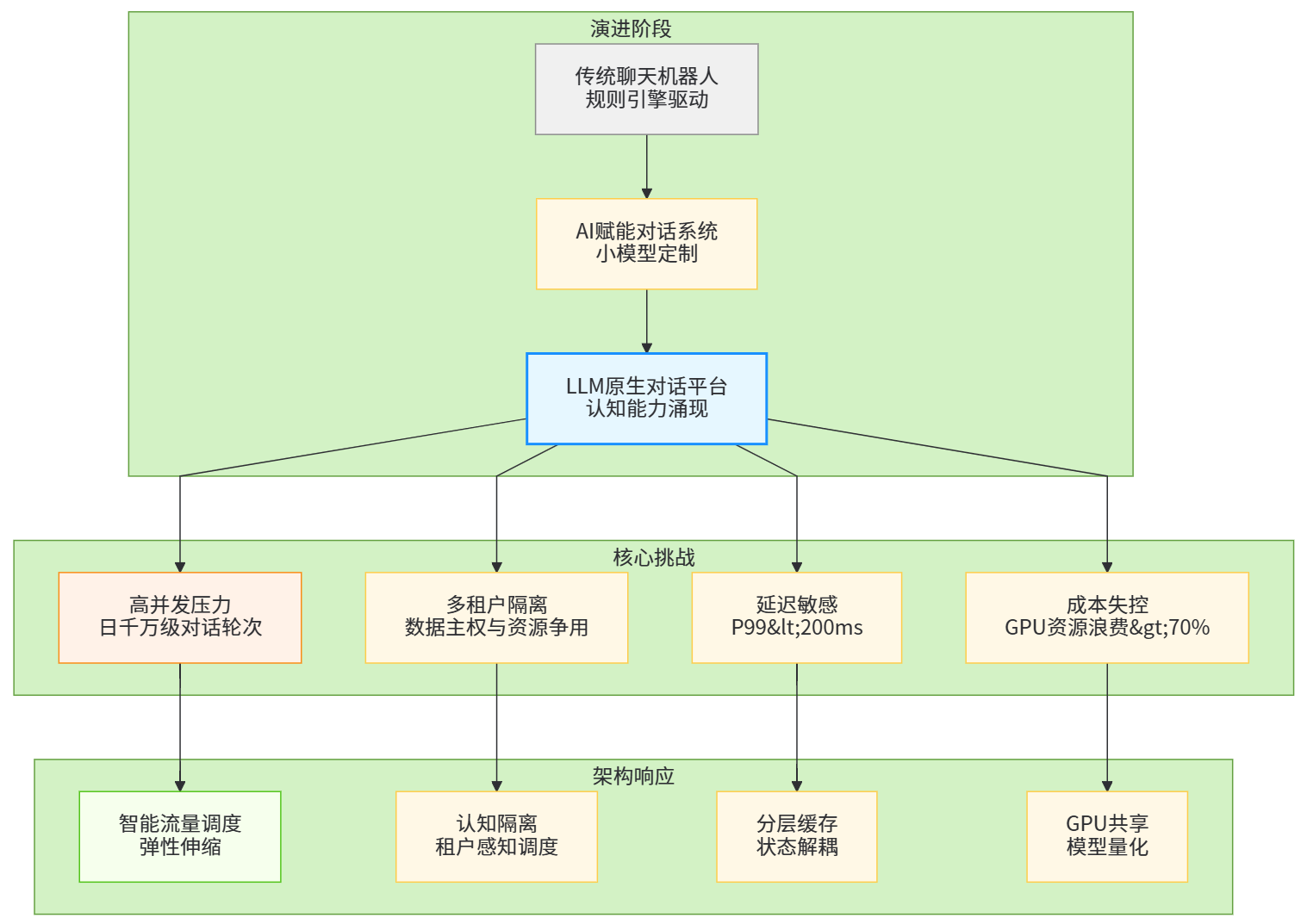 在数字化转型浪潮的推动下,对话机器人正从边缘创新应用演变为支撑企业核心业务的关键基础设施。从电商客服到金融投顾,从医疗咨询到政务办理,对话式AI已深度嵌入千行百业的价值链条,其服务质量直接决定了用户体验的底线与企业运营的效率天花板。这种角色转变带来的不仅是功能丰富度的提升,更是技术架构的系统性升维——单日千万级对话轮次、毫秒级响应延迟、99.99%可用性保障、多租户资源隔离与成本优化的多维要求,共同构成了当代对话系统架构设计的根本性挑战。尤其当大语言模型(LLM)能力边界不断拓展,对话机器人承载了越来越复杂的推理任务,单次请求的计算开销较传统NLP模型激增数十倍,这使得高并发场景下的资源调度、租户隔离与服务稳定性成为架构设计的首要矛盾。本文将从基础设施视角出发,系统剖析高并发多租户对话服务的架构设计范式,结合2024-2025年最新开源实践与产业级解决方案,深入探讨流量调度、状态管理、服务治理、安全隔离与成本优化的全栈技术路径,为构建可支撑百万级并发、具备弹性伸缩能力的工业化对话平台提供方法论与实践参考。
