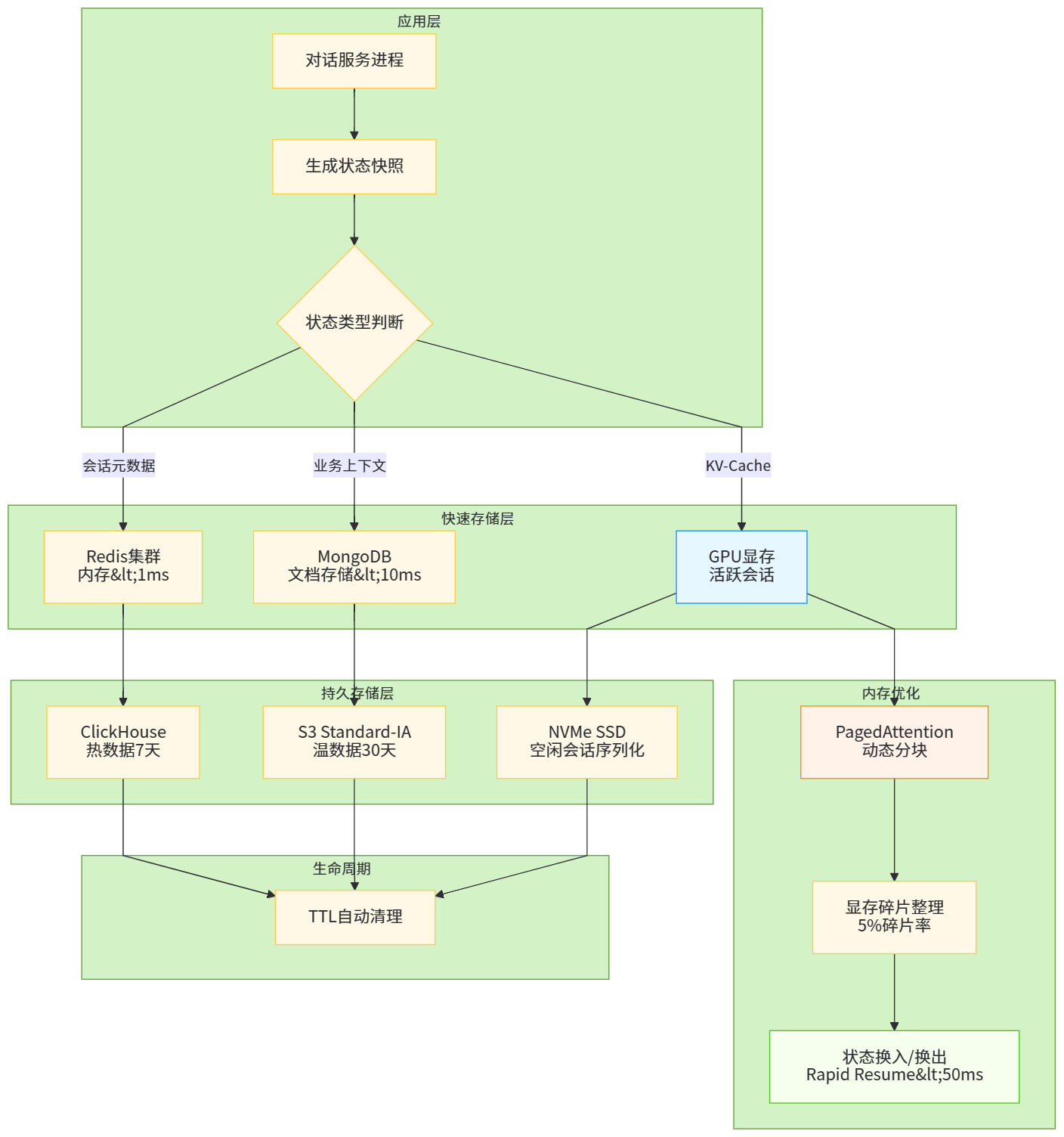 对话机器人的状态管理是架构设计中最具挑战性的环节。理想的无状态设计便于弹性伸缩,但对话天然依赖上下文;强状态集中存储保证一致性,却成为性能瓶颈与单点故障源。现代架构通过状态分离与分层缓存破解这一悖论:将对话状态拆分为会话元数据(会话ID、租户ID、时间戳等)、业务上下文(用户意图、实体槽位、对话历史)与模型运行时状态(注意力缓存、KV-Cache)三层。会话元数据采用Redis集群存储,利用其高吞吐与低延迟特性支撑百万级并发访问;业务上下文写入分布式文档数据库MongoDB,通过TTL索引自动清理过期会话,存储成本降低60%;模型运行时状态则留在GPU显存中,通过PagedAttention技术实现动态内存管理,将显存碎片率从35%压缩至5%以下。更关键的突破在于状态快照与延迟加载机制:当会话空闲超过30秒,系统将显存中的KV-Cache序列化后转存至NVMe SSD,释放GPU资源;新请求到达时通过Rapid Resume技术在50ms内完成状态恢复。字节跳动的实践表明,该机制使其GPU集群的日活会话承载量提升3.2倍,同时保持P95延迟在300ms以内。