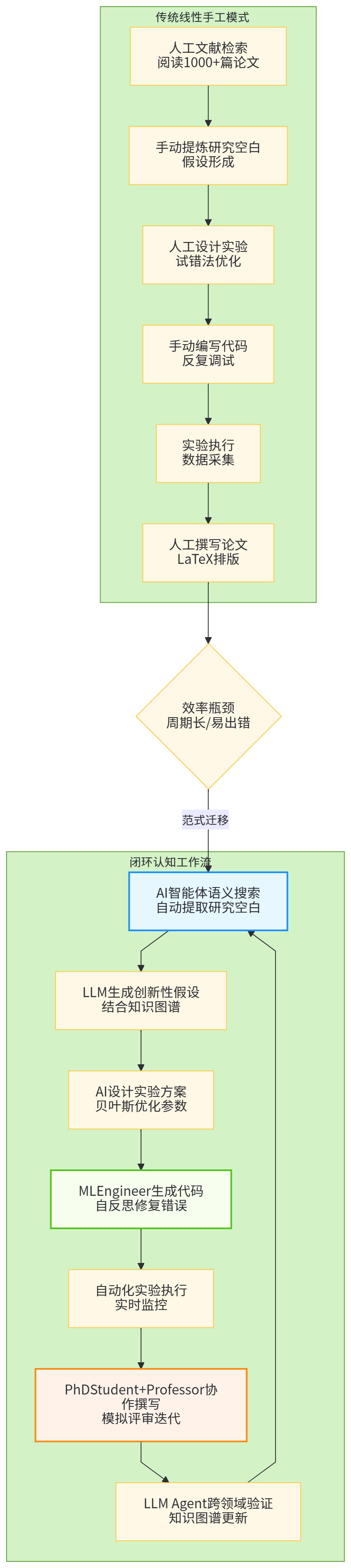 【图1:自动化科研工作流从线性手工模式到闭环认知模式的范式迁移示意图】