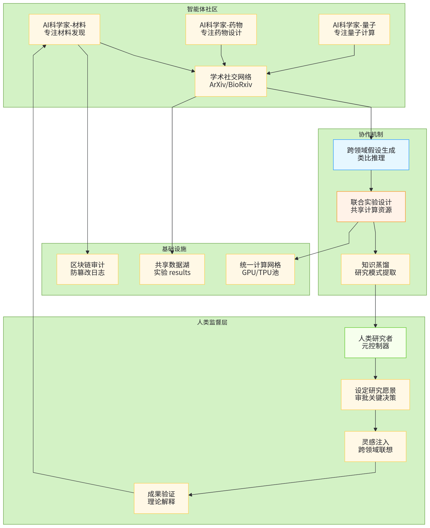 多智能体科学社区(Multi-Agent Science Community) 是另一前沿方向。数百个AI科学家智能体专注于不同领域,通过学术社交网络共享成果、互相评审、协作研究。当一个智能体在量子计算领域发现新算法,立即通知相关领域的智能体,共同探索交叉应用。这种集体智能可能超越任何单一人类团队,加速跨学科突破。但这也带来信息过载与噪声放大风险:低质量结果在社区中传播,误导其他智能体。需设计信誉机制:智能体的"学术声誉"基于其成果被人类验证的成功率,声誉低的建议被降权,形成质量过滤。