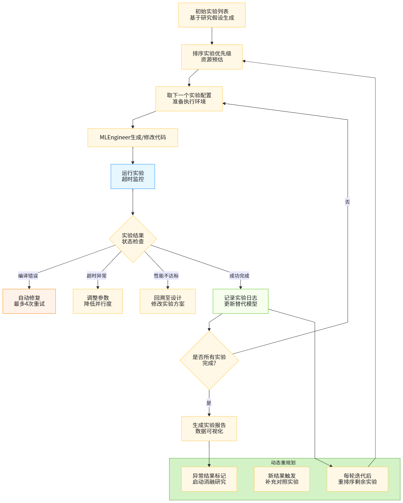 实验设计的自动化价值必须通过执行-反馈-迭代闭环实现。AI Scientist框架中,编码助手Aider按顺序执行实验列表,每个实验完成后记录日志并触发重规划,最多迭代5次。这种机制的核心是错误驱动的动态调整:当实验因参数不兼容失败时,系统不仅修正代码,更反思实验设计的合理性。例如,在训练图神经网络时,若学习率过大导致损失爆炸,MLEngineer会主动降低学习率并增加Warmup阶段,同时扩大Batch Size以稳定训练。更复杂的场景涉及多实验协同:当发现单一实验无法验证假设时,系统自动设计对比实验(ablation study),通过控制变量法识别关键因子。