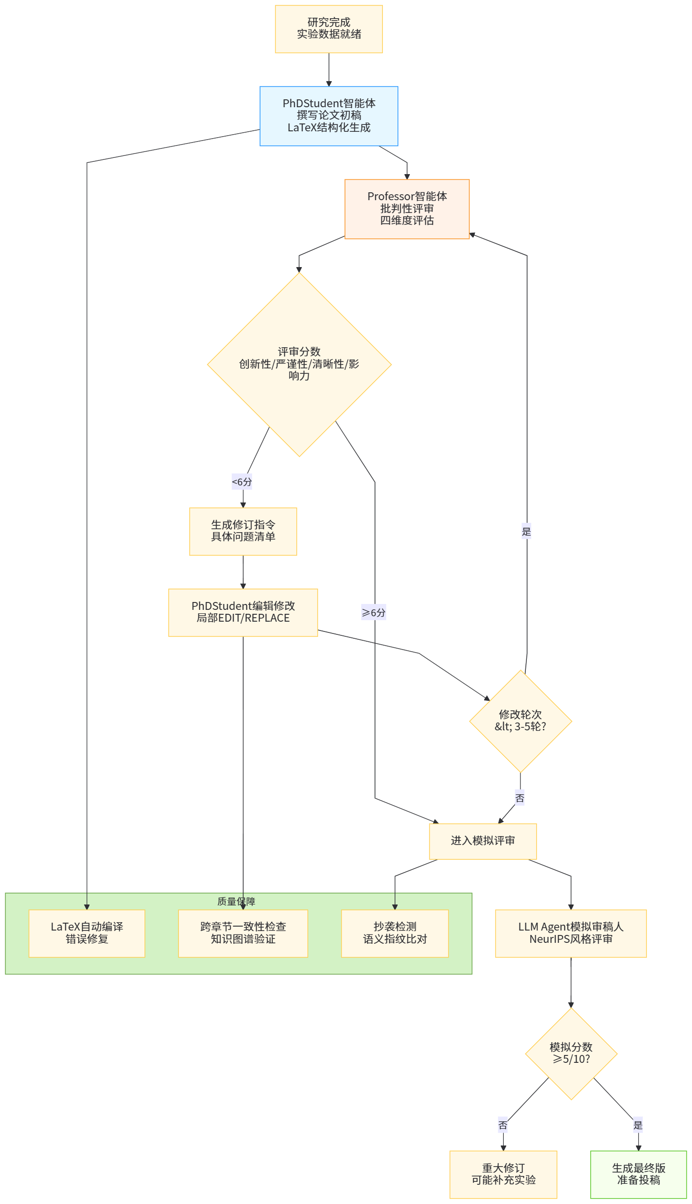 高质量学术论文通常需多轮修改与多方协作。AgentLaboratory模拟这一人类协作过程,由PhDStudent智能体负责初稿撰写,Professor智能体负责批判性评审与修订。PhDStudent生成初稿后,Professor从创新性、严谨性、清晰性、影响力四个维度评估,每次评估生成修订指令(Revision Directive),如"在实验部分增加对异常值的鲁棒性分析"、"在讨论部分对比SOTA方法的计算复杂度"。PhDStudent接收指令后,通过EDIT命令进行局部修改,而非重写全文,保持修改的高效性与可追溯性。这种双智能体对抗机制模仿导师-学生互动,使论文质量在3-5轮迭代后显著提升。