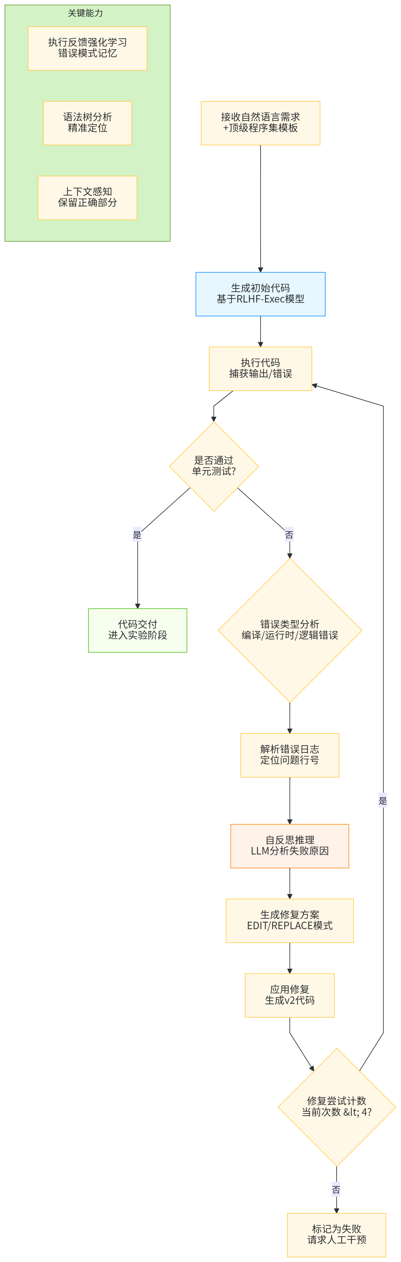 2024-2025年的最新突破在于大模型规模的持续扩展与代码专用架构的优化。GPT-4o在代码生成评测HumanEval上取得90.2%的准确率,较GPT-4的67%提升23个百分点,其提升不仅源于参数规模的增长,更关键的是引入了执行反馈强化学习(RLHF-Exec)。与传统RLHF依赖人类偏好奖励不同,RLHF-Exec通过实际执行生成的代码,将编译错误、运行时异常、单元测试结果作为直接奖励信号,使模型学会生成可运行、可调试、可优化的代码。AMD开源的AgentLaboratory中,MLEngineer智能体正是利用此类模型,在实验设计环节展现出惊人的自修复能力:当初始代码出现运行时错误时,它能解析错误日志,定位问题代码行,并通过EDIT或REPLACE模式进行修复,最多尝试4次直至获得正确实现。这种"生成-验证-修复"的闭环机制,将代码生成的成功率从传统方法的60%提升至85%以上。
