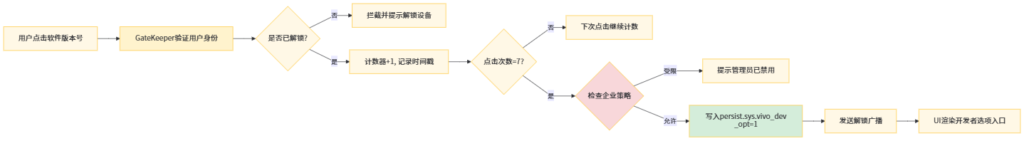 persist.sys.enterprise.developer_mode属性被强制设为0,此时七次点击仅触发Toast提示Developer mode disabled by admin,不会实际解锁。该策略在日志中体现为E DevelopmentSettings: Knock limit reached but policy prevents unlock。