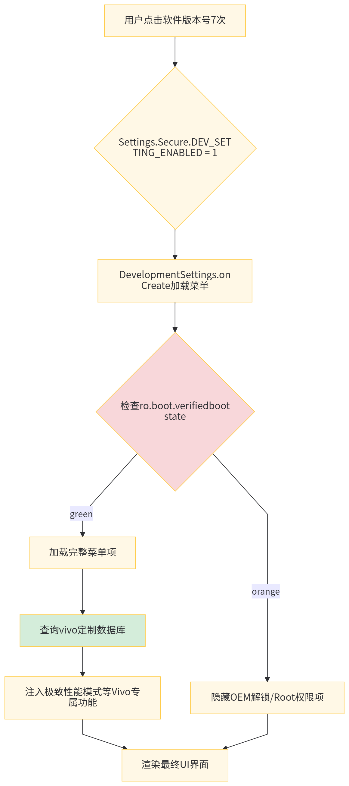 该开发者选项菜单共包含43个一级功能项与若干二级子项,横向对比Android 15原生AOSP仅28个可见项的配置,Vivo扩展了系统内存优化级别、极致性能模式、一键修复应用、HDCP检测等15个定制功能。这些扩展项中,约60%通过重写packages/apps/Settings/src/com/android/settings/DevelopmentSettings.java实现UI注入,剩余40%通过vendor/vivo/frameworks/base/core/java/android/provider/VivoSettings.java扩展Secure Settings数据库字段完成。值得注意的是,所有Vivo定制项的Preference键名均以vivo_developer_前缀标识,与原生debug_前缀形成命名空间隔离,这降低了系统升级时的合并冲突风险。