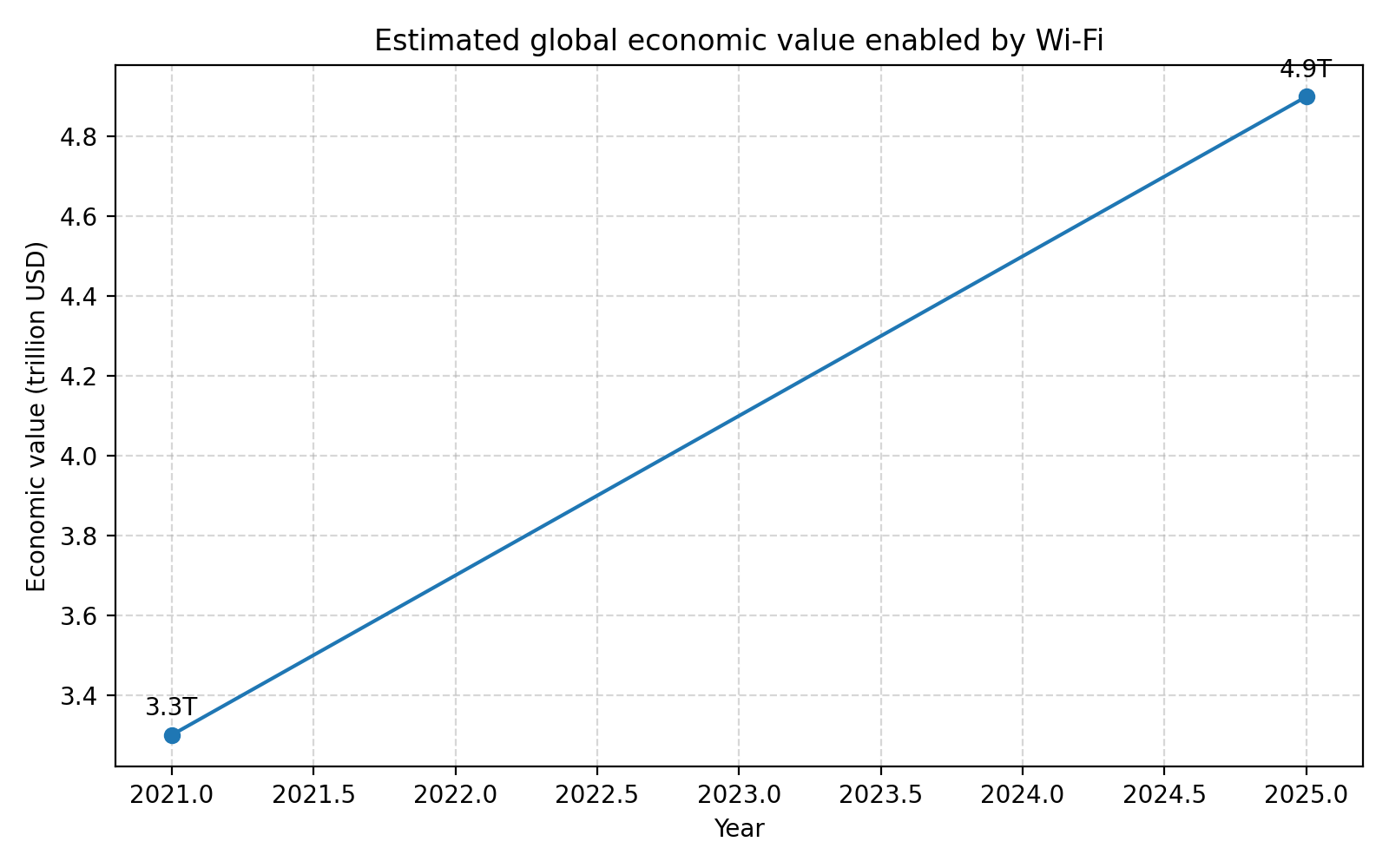 Wi-Fi 联盟在 2021 年委托的一项研究中估计,Wi-Fi 的全球年度经济价值在 2021 年约为 3.3 万亿美元,并预计 2025 年将达到约 4.9 万亿美元(Wi-Fi Alliance)。同一系列资料反复强调的一个判断是:今天超过一半的互联网流量是通过 Wi-Fi 传输的,Wi-Fi 已经从“局域网的补充”变成“全球互联网的关键基础设施之一”(Wi-Fi Alliance)。