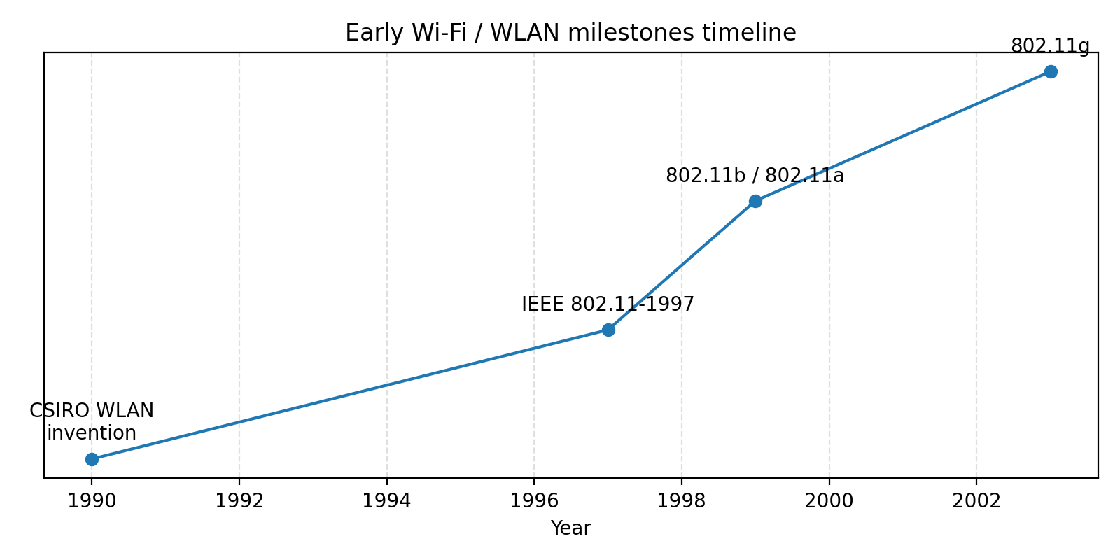 | 1990s | CSIRO 在射电天文研究基础上发明并申请 WLAN 关键专利 | 解决室内多径产生的“reverberation”问题,被广泛认为是现代 Wi-Fi 的技术基础之一(csiro.au) |