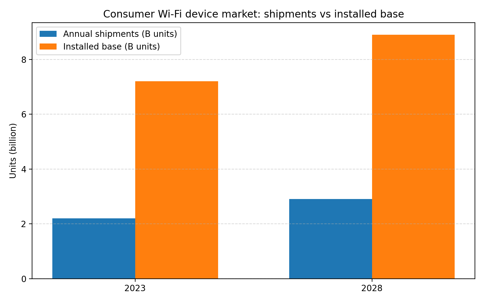 与此同时,研究机构 TechInsights 从消费电子视角给出了一组更细化的数据。根据 IT 之家和其它媒体对其报告的转述,2023 年全球 Wi-Fi 设备出货约为 22 亿台,较上一年下降 3%,但预计 2028 年会增长到 29 亿台,年复合增长率约 4%;2023 年全球 Wi-Fi 设备的“市场存量”(installed base)约为 72 亿台,预计 2028 年会达到 89 亿台,同样对应约 4% 的复合增速(IT之家)。
