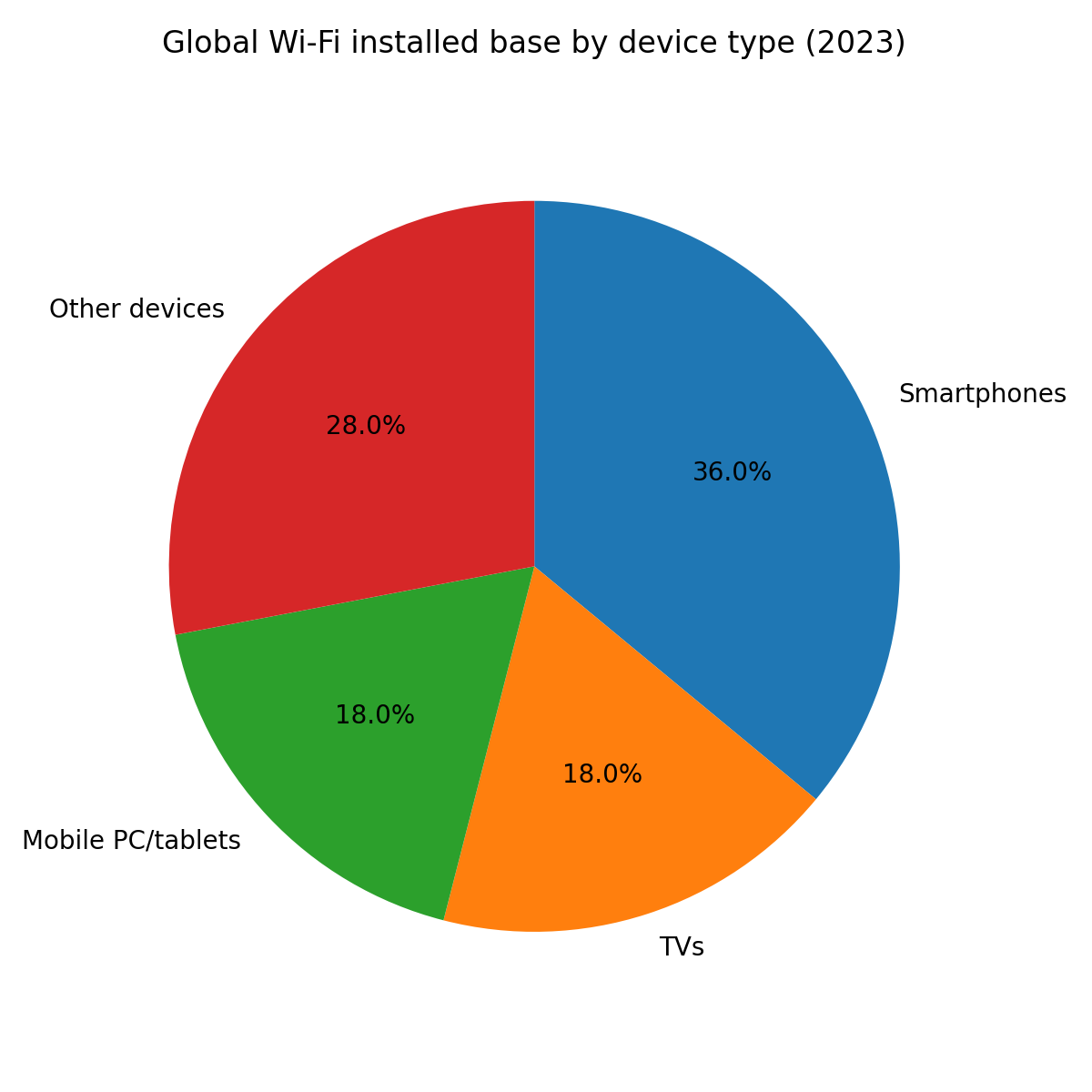 最后,利用刚才提到的那组结构数据,把 2023 年装机量中不同设备类别的占比画成饼图,就能清楚看出当前 Wi-Fi 生态里谁在主导。