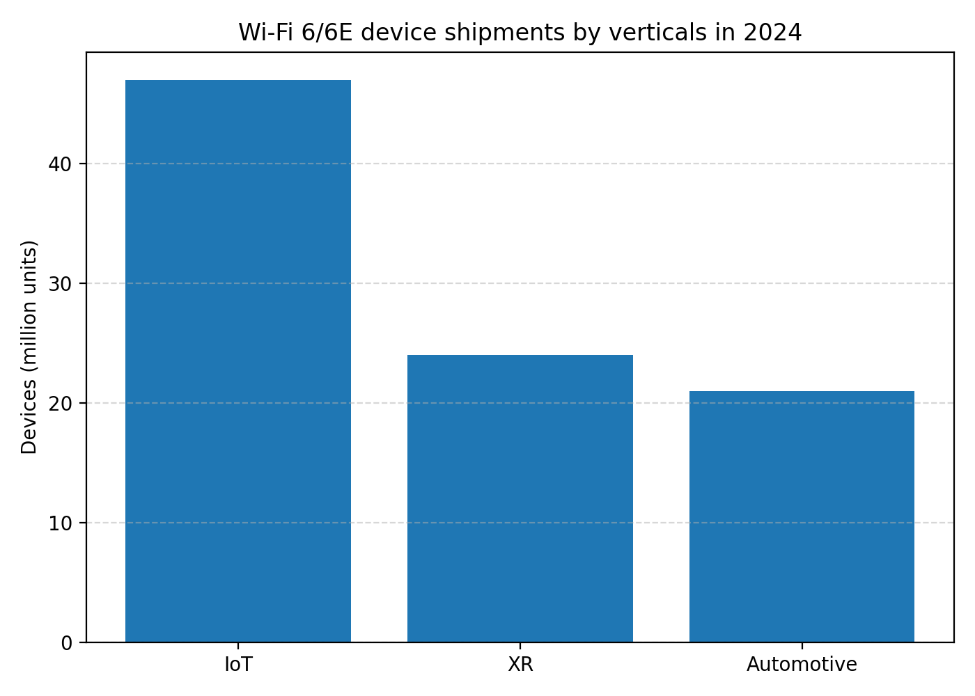 从产业侧的角度看,Wi-Fi 6 / 6E 的渗透速度非常快。Wi-Fi 联盟在 2024 年的一份“State of connectivity”报告中给出估计:2024 年 Wi-Fi 6(包括 6E)设备在 IoT 领域的出货会超过 4700 万台,在 XR(AR/VR/MR)领域超过 2400 万台,在汽车领域则有 2100 万台以上出货(Wi-Fi Alliance)。这三类场景其实很好地刻画了 Wi-Fi 6 的定位:它既要支撑大量小数据量的 IoT 终端,又要支撑高带宽低延迟的 XR 体验,还要支撑车内娱乐和 OTA 等对可靠性有要求的应用。