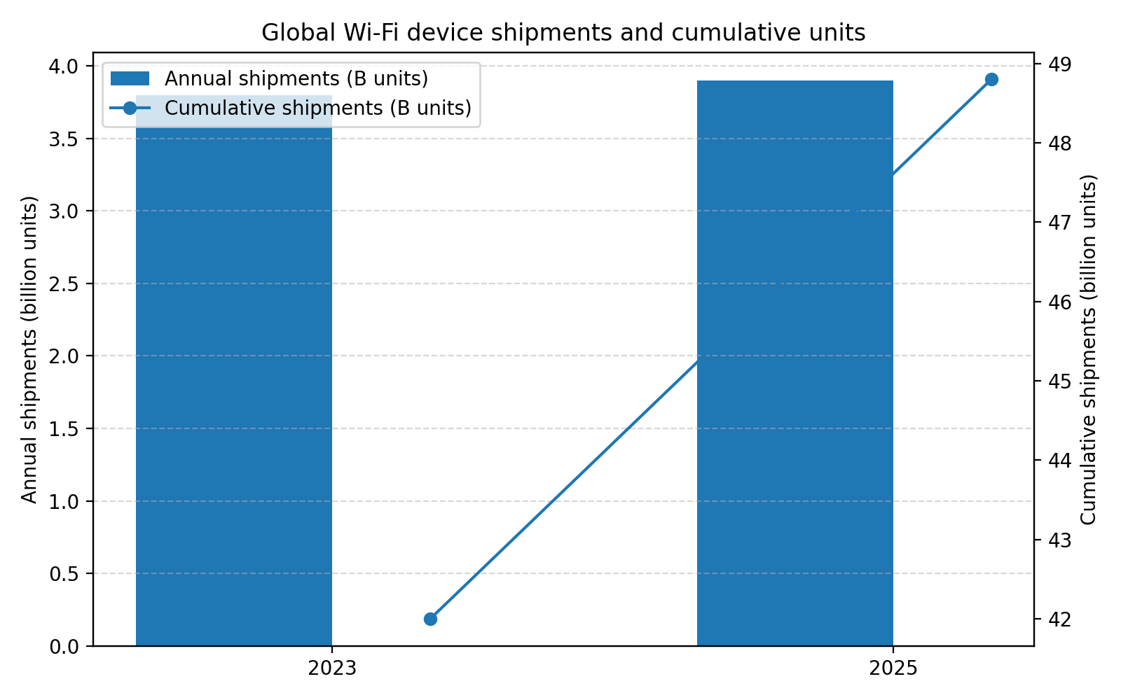 | 2023 | 历史累计出货 | 420 亿台 | 同一报告中给出的累计数字(Wi-Fi Alliance) |