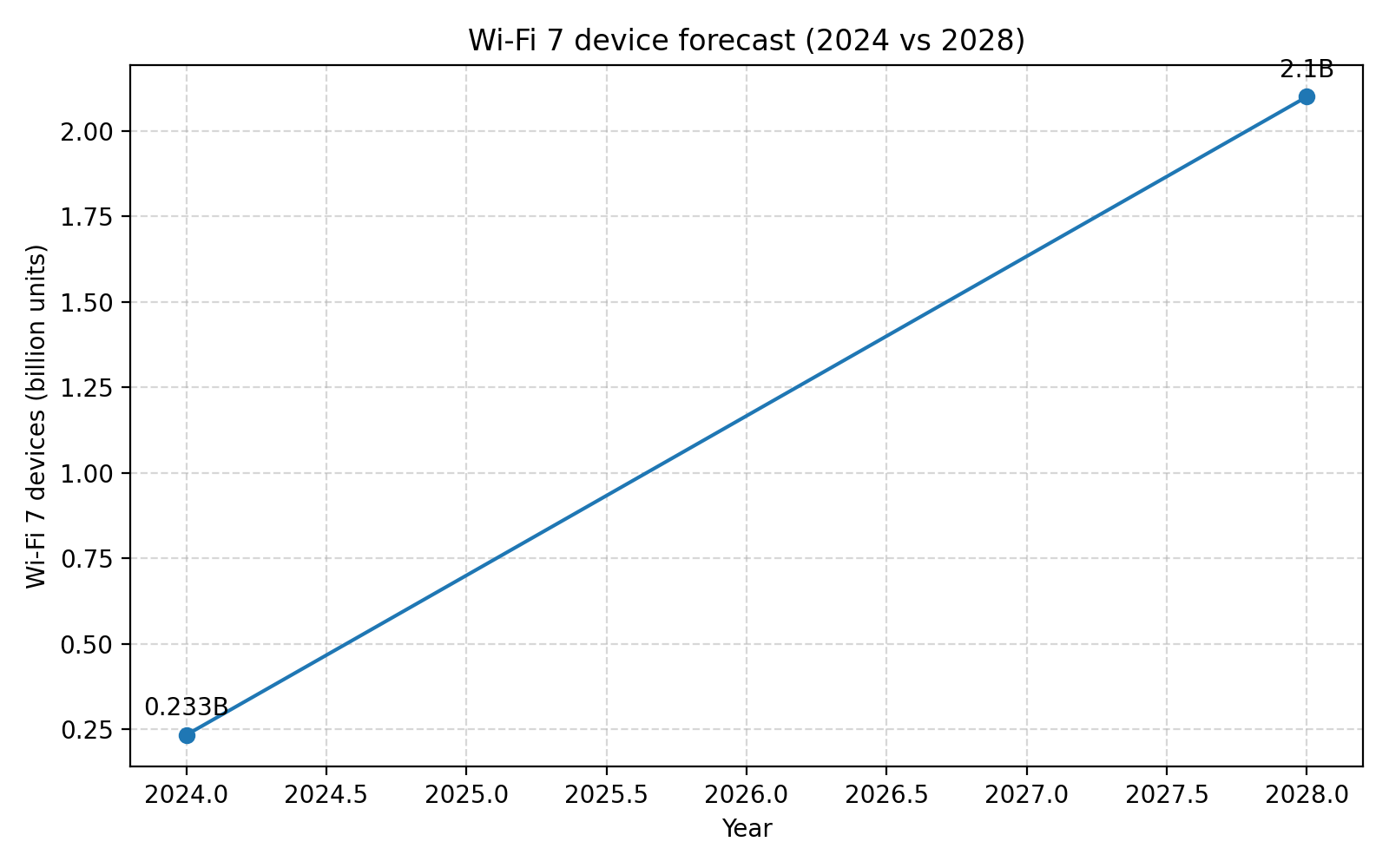 Wi-Fi 联盟在 2024 年 1 月正式推出 Wi-Fi CERTIFIED 7 认证,宣告 Wi-Fi 7 从标准草案走向互操作性验证、再走向商用设备的阶段性完成(Wi-Fi Alliance)。在这份发布稿中,联盟给出了一个非常激进的市场预期:2024 年会有超过 2.33 亿台 Wi-Fi 7 设备进入市场,而到 2028 年预计会有 21 亿台 Wi-Fi 7 设备出货(Wi-Fi Alliance)。结合 2023 年全球 Wi-Fi 设备出货 38 亿台、累计 420 亿台的整体规模(Wi-Fi Alliance),以及 2025 年预计出货 39 亿台、累计 48.8 亿台的预估(Wi-Fi Alliance),可以想见 Wi-Fi 7 会在很短时间内占据新出货设备中的相当比例。