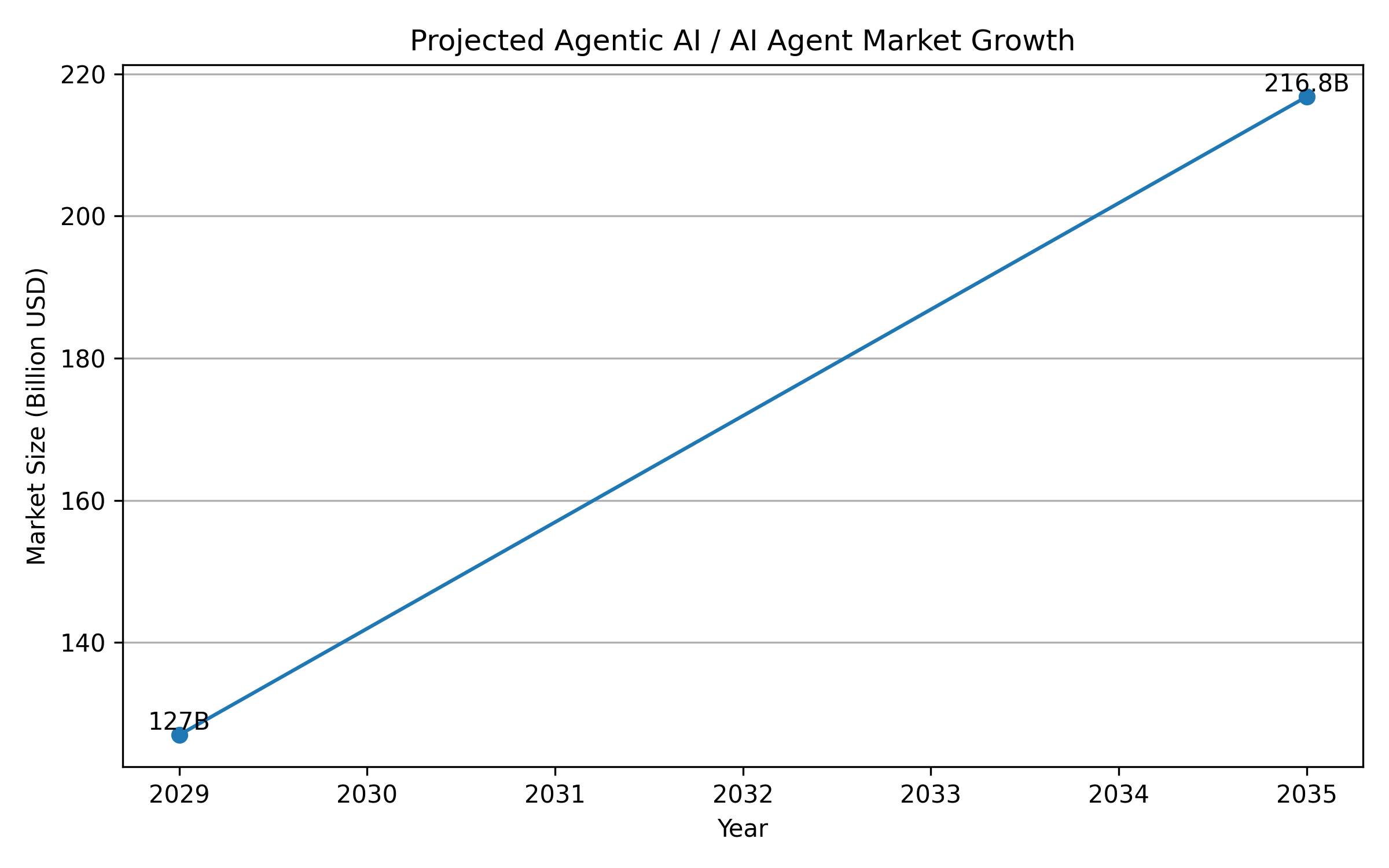 | AI Agent 市场规模与增长 | 预计到 2035 年 AI Agent 市场规模约 2168 亿美元,CAGR 约 35%。(GlobalCloudTeam) | 多智能体作为该市场的重要组成部分,被视作推动增长的关键技术。 | 提示在 Agentic AI 的整体浪潮中,多智能体是 “顺风船”。 |