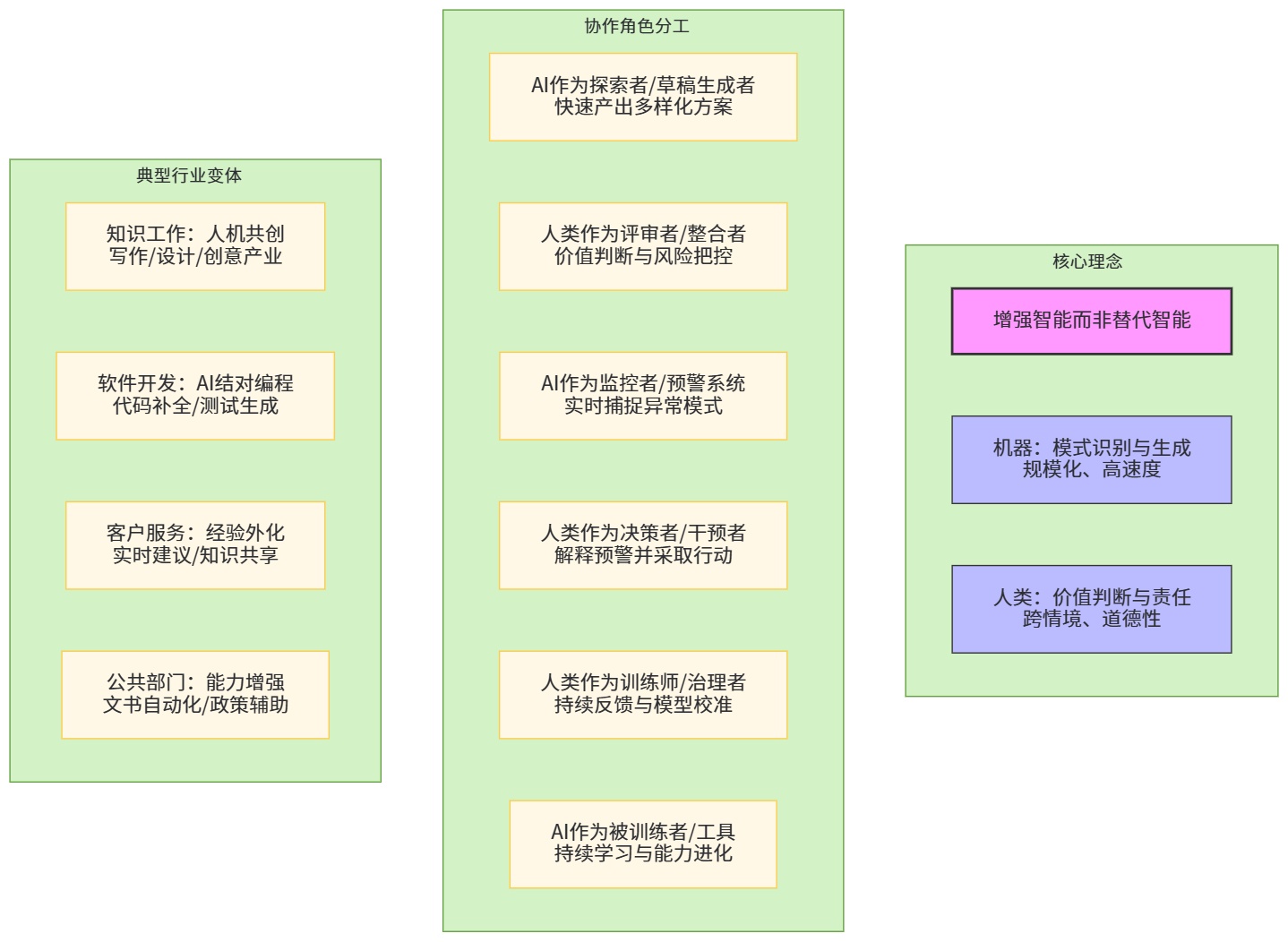 这张表背后的故事是:AI 采用正在迅速从“早期试验者”向更大范围扩散,却又呈现明显的不均衡;而这种扩散的方式越来越体现为“人机协作”而非“人类退出”。因此,系统性地理解和构建“AI 与人类协作新范式”,不仅是学术问题,更是产业和政策实践中的紧迫任务。本文将在综述现有工作和基础理论的基础上,提出一个以“增强智能”为核心的协作框架,并通过多领域案例说明其设计原则、技术实现路径和治理要求。