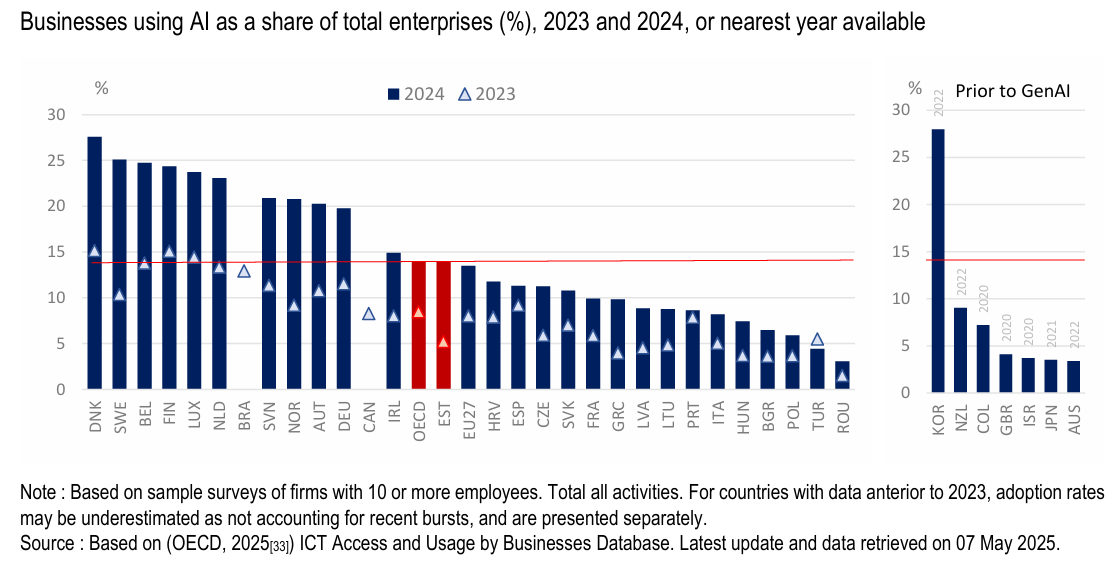 | 美国 | 2025 | 用 AI 生产商品或服务的企业比例 | 8.3% (OECD) |