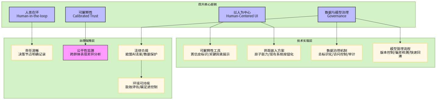 “增强智能”强调的是让人类“更强”,而不是让系统“更复杂”。因此,协作系统的界面和流程设计应围绕人类的认知与工作流来展开,而不是让用户适应模型的工作方式。这在公共部门的调查中尤为明显:许多一线人员愿意使用生成式 AI 的前提是“它能嵌入我已经熟悉的工具和流程”,例如在电子病历系统或公文系统中添加一个“AI 建议”按钮,而不是要求他们切换到全新的平台。(arXiv)