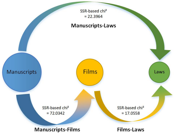 | Manuscripts → Films | 2 | SSR-based χ² | 72.0342 | 0.0000 | 2 期滞后显著,论文对电影有延迟预测力 |