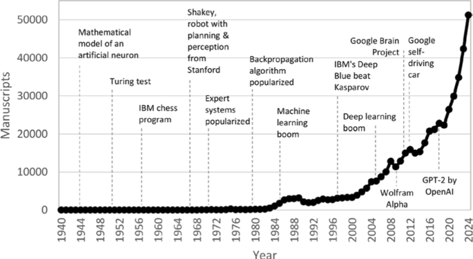 在时间维度上,AI 文献呈现出几个清晰的加速阶段:早期围绕人工神经元和专家系统的小规模增长,到 1990 年代后期机器学习与统计学习兴起时的加速,再到 2010 年代深度学习与大数据驱动下的爆发式增长,以及近几年生成式模型登场后的二次陡升。文献数量不仅平滑上升,更与历史上被普遍认为关键的技术里程碑—如 Turing Test、Deep Blue、AlphaGo 等—在时间上高度对应,这些里程碑常常被标注在同一图中,构成技术演化与科研产出共振的直观图景。