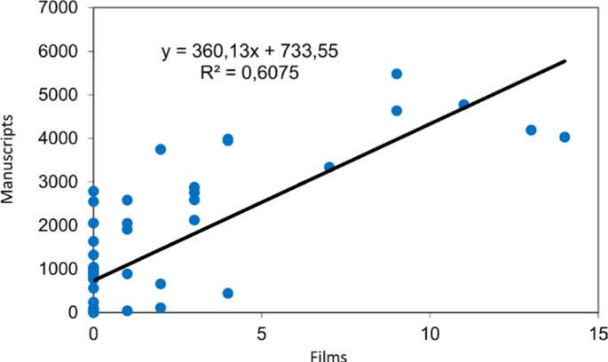 其次,研究还对“研究–电影–立法”三者之间的关键词时间序列进行了回归分析。以“artificial intelligence”作为核心关键词,分别统计其在学术文献与影院影片中的年度出现频率,发现两条曲线同样表现出显著的线性关系,决定系数 R² 约为 0.607,说明技术话语与文化话语在时间上同步聚焦于 AI 这一核心概念。