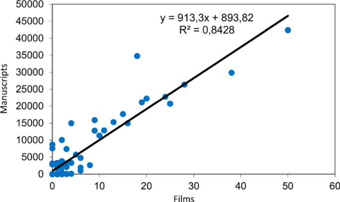 在统计处理上,首先对“论文–电影”之间的关系进行线性回归,发现从 1950 年后(电影工业大规模发展之后)到 2023 年,两者在年度数量上呈现出显著的正相关,拟合的决定系数 R² 约为 0.843,p 值远小于 0.05,这意味着电影产量的变化可以解释相当大比例的科研产出方差。当然,这并不意味着电影“导致”论文增加,而是一种强烈的协同演化信号。
