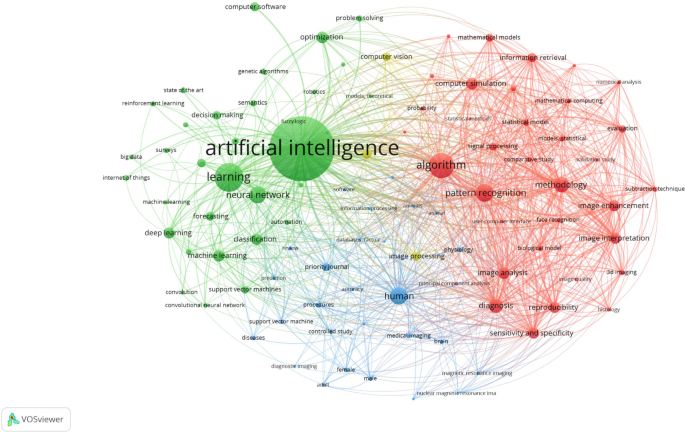 为了理解研究主题的内部结构,分析还使用 VOSviewer 对关键词进行了共现网络构建。通过对数十万篇文献中的关键词进行预处理、归一化和聚类,可以得到一个由上千个节点构成的语义网络,其中“大数据”“机器学习”“深度学习”“神经网络”“机器人”“自然语言处理”“计算机视觉”等高频词汇形成若干紧密簇团。不同颜色代表不同主题簇,节点大小对应词频,边的粗细则表示共现强度。这个网络既可以被理解为 AI 研究内部的“知识地图”,也可以被视作科研共同体对“什么是 AI、AI 在做什么”的集体回答。