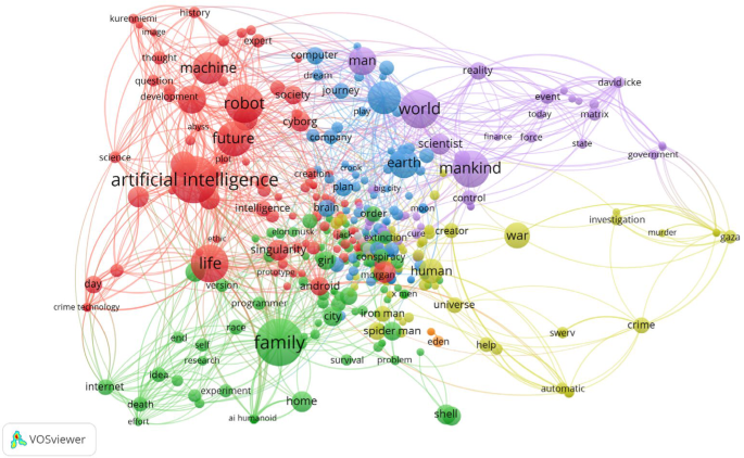 为了进一步理解电影叙事中的主题结构,相关研究对影片标题与剧情简介中的约 1.9 万个词汇进行了预处理,筛除专有名词、代词、冠词等后,选取前 500 个代表性词汇构建共现网络。结果显示,“family”“artificial intelligence”“life”“world”“robot”“future”等词汇在网络中处于核心位置,而“humanity”“human”“war”等词则把技术想象与伦理、冲突和存在性焦虑连接在一起,构成围绕“先进技术–未来场景–社会后果”的叙事核心。