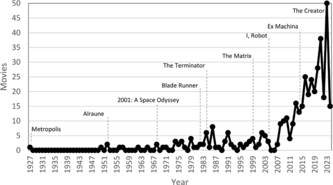 与文献计量分析相平行,研究者利用 IMDb(Internet Movie Database)构建了一个 AI 主题电影数据集。具体做法是在 IMDb 高级检索中以 “artificial intelligence” 为关键词,筛选出与 AI 相关的影片,并只保留那些“AI 在故事中扮演核心叙事角色”的作品,以减小噪声。最终得到 415 部影片,时间跨度从上世纪中叶到近年。