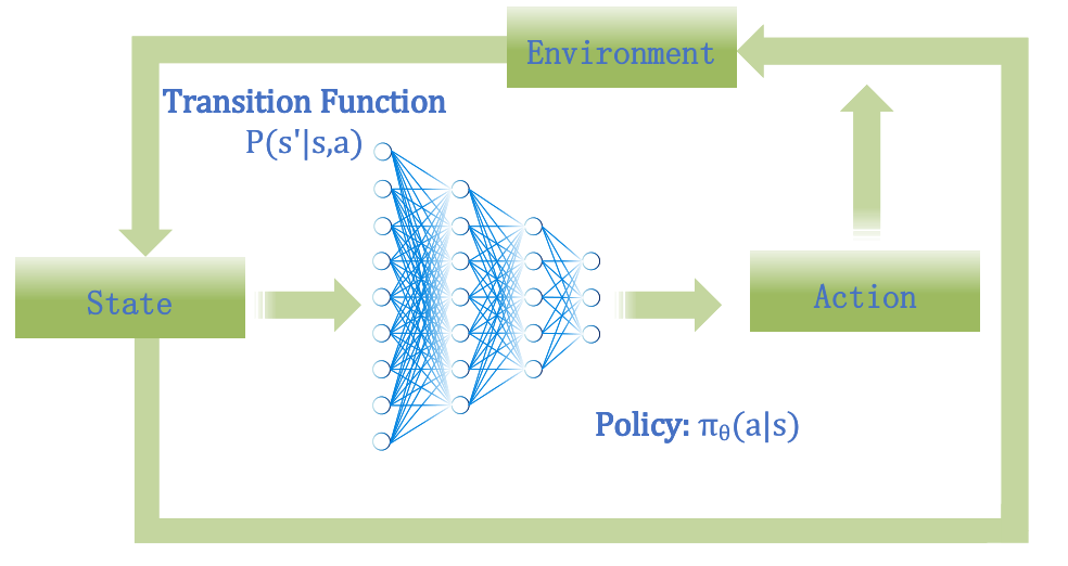 各要素的含义分别为:S 是状态空间,A 是动作空间,P 是状态转移概率函数,R 是奖励函数,γ 是折扣因子。在 MDP 框架中,智能体在状态执行动作