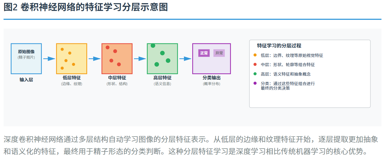 分类是精子形态学分析的另一个核心任务。相比分割的像素级操作,分类是对整个精子或其结构进行高层的语义判断,例如判断精子是否正常、属于哪种异常类型等。在这个任务上,卷积神经网络已经被证实为非常有效的工具。CNN通过学习从低层的边缘和纹理到高层的形状和语义概念的特征层次,能够准确地识别精子的形态特征。