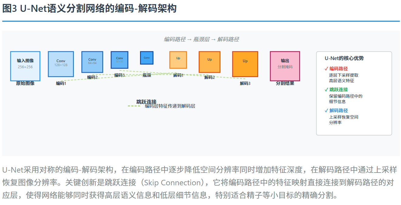 深度学习方法,特别是基于全卷积网络的语义分割方法,为这些问题提供了新的解决方案。U-Net是针对医学影像分割特别优化的经典架构,采用了编码-解码结构。在编码阶段,通过逐步的卷积和池化操作降低空间分辨率,同时增加特征通道数,使网络能够学习到高层的语义特征。在解码阶段,通过上采样操作逐步恢复空间分辨率,同时利用跳跃连接将编码阶段的特征映射与解码阶段的对应层进行融合。这种设计使得模型既能够捕捉高层的语义信息,又能够保留细节信息,特别有利于精子等小目标的精确分割。