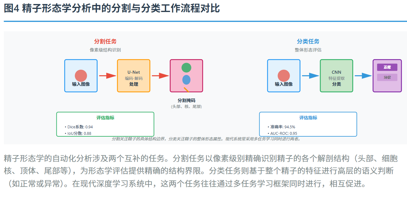 在精子形态学分析中,图像分割和分类是两个核心任务,它们分别对应于结构识别和类型判断两个不同的层次。