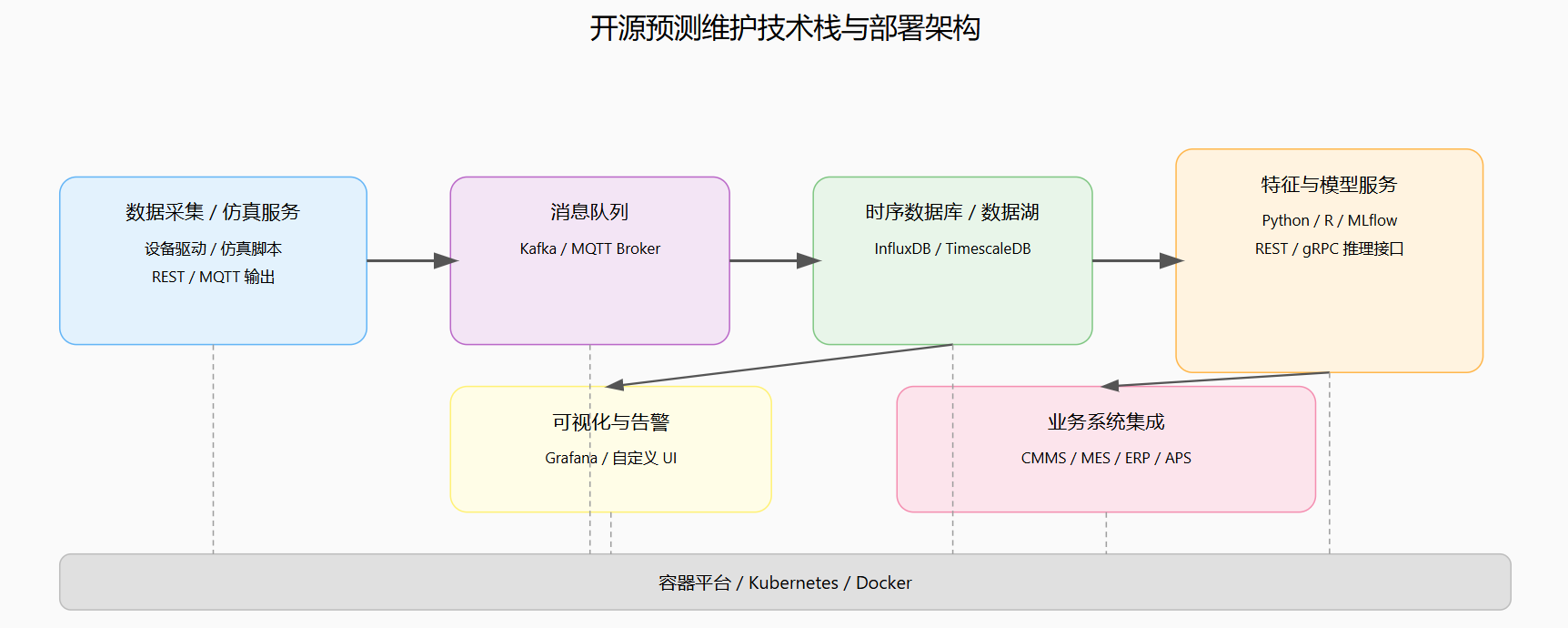 这些开源项目为工业工程师提供了非常实用的参考:一方面,可以直接复用其中的模型结构、数据处理脚本和可视化仪表盘,加速 PoC 阶段的验证;另一方面,它们也展示了在真实工业场景中如何用容器化、流式处理框架和可观测性工具将预测维护模型“产品化”。