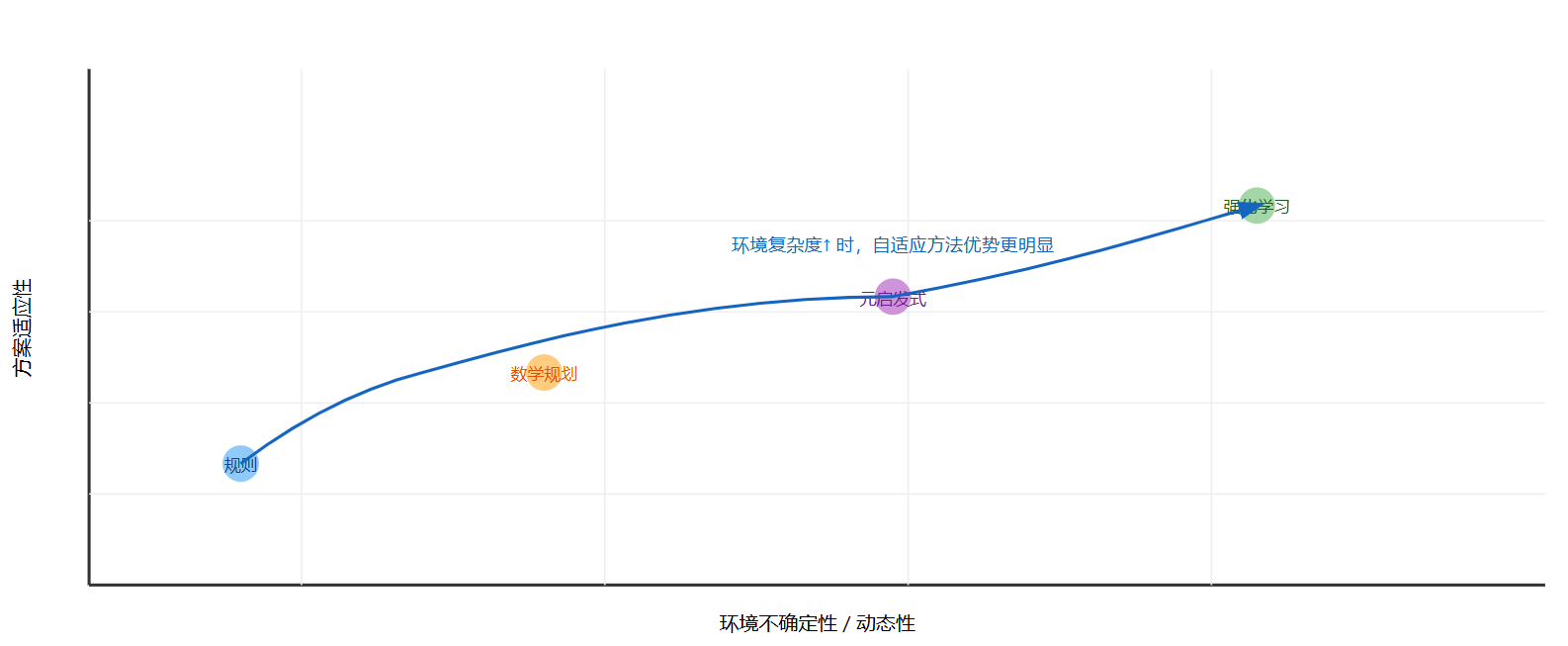 图6:传统规则调度、数学规划和强化学习调度在复杂性与适应性上的对比示意图
