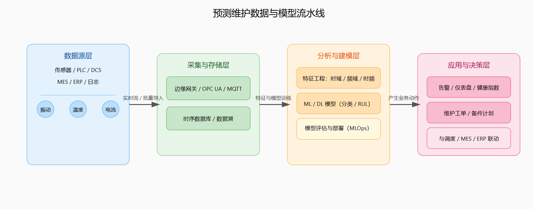 从大量实践和文献案例来看,预测维护项目往往经历从“单机 PoC”到“生产线/车间级推广”,再到“多工厂协同”的演进路径。2024 年发布的一系列综述工作强调,成功的预测维护部署通常具备三大特征:以业务价值驱动(从高停机成本的关键资产切入)、以平台化架构支撑(数据与模型能力复用)、以组织能力建设为保障(维护与 IT/数据团队协同)。(科学直接)