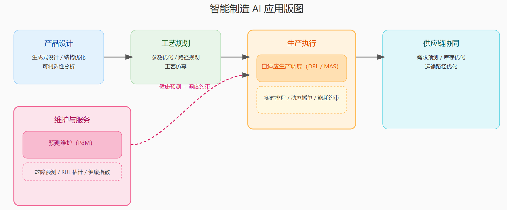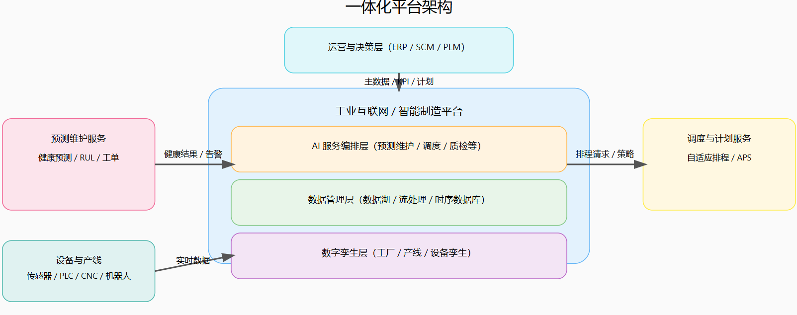 在传统工厂里,维护系统和生产调度系统往往彼此割裂:维护部门关心设备是否会坏、何时停机,而计划/调度部门关心订单能否按时交付、产能是否足够。AI 落地为打通这两套系统提供了技术基础:如果可以在统一的数据平台中同时获取设备健康状态、订单优先级和资源约束信息,就可以通过联合建模实现更高层次的全局优化。
