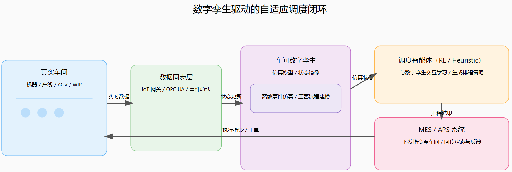 从工程视角看,一个可落地的自适应调度系统通常包含以下几个关键组成部分:第一,可信的仿真或数字孪生环境,用于在安全环境中训练和评估调度策略;第二,可在线更新的调度策略部署机制,使 RL 策略或智能启发式能够在真实车间中以“建议+人工确认”或“半自动执行”的方式运行;第三,与 MES、APS 和 ERP 的数据接口,使调度系统能够实时获取订单、库存、设备状态和工艺参数,并将调度结果推送到执行系统。Chang、Chen、Du 等人的研究工作表明,通过网络化 CPS、多智能体系统与数字孪生的结合,可以在保证安全和可控的前提下,在真实车间环境中逐步引入自适应调度。(SAGE Journals)