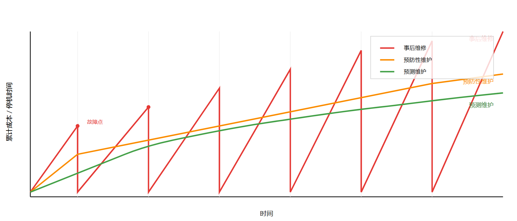 图2 :不同维护策略(事后维修、预防性维护、预测维护)在成本和停机时间上的对比曲线