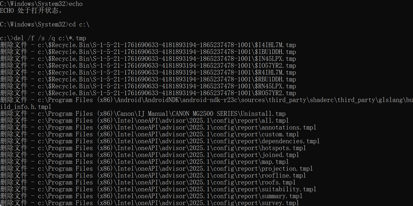 在实践中,如果目标只是清理临时目录、日志目录以及应用缓存所在的特定路径,那么 del 是一种非常高效的工具。例如,当我们确知 C:\Windows\Temp 目录下的大多数内容只是在系统更新和安装过程中产生的中间文件,就可以在管理员命令提示符中使用类似如下的脚本片段进行清理: