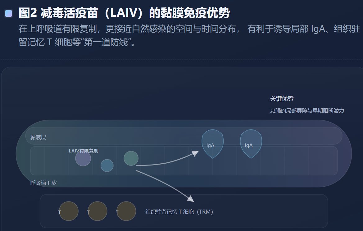 LAIV则更像是“以低风险方式模拟自然感染”。其在上呼吸道有限复制,能在局部黏膜层面诱导IgA与组织驻留记忆T细胞等更接近自然感染的免疫成分。综述指出,LAIV诱导的免疫反应具有更“广谱、类自然感染”的特征,在儿童中临床保护优势更明显,这也提示了黏膜免疫在流感防御中的重要性。(PMC) 这种优势并不必然在成人中同等复刻,部分原因可能与既往感染史、基线免疫景观以及鼻黏膜局部免疫微环境差异有关。