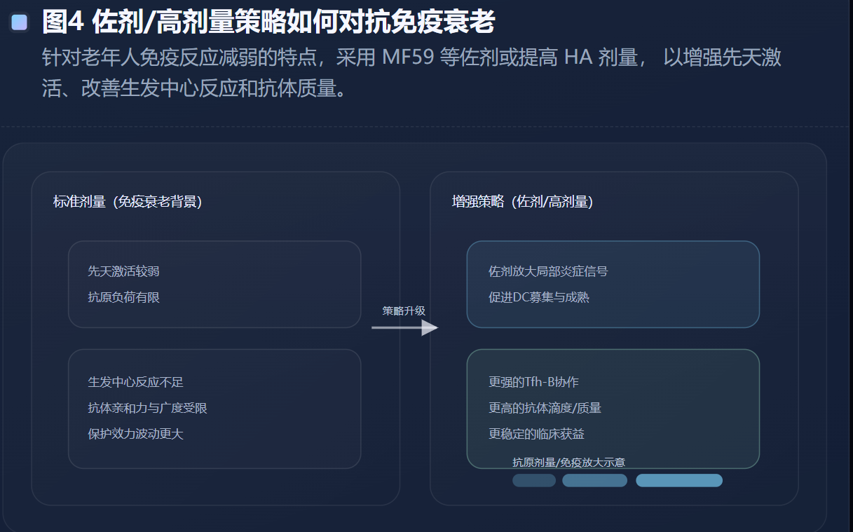 在老年人群的免疫原性比较研究中,佐剂与高剂量之间究竟孰优孰劣并非总是“非黑即白”。一项随机临床试验比较MF59佐剂三价疫苗与高剂量三价疫苗,报告A(H3N2)血清转换率在佐剂组为32.8%(112/342),高剂量组为38.5%(130/338),差异约-5.8%且未达到预设的非劣界值;与此同时,其他株的转换率、血清阳性率与部分GMT指标差异并不显著或呈现更复杂的年龄分层特点。(SpringerLink) 这一结果非常“免疫学真实”:当我们企图用单一指标宣布平台优劣时,真实的人群免疫系统常常给出更细腻也更难被一句话概括的答案。