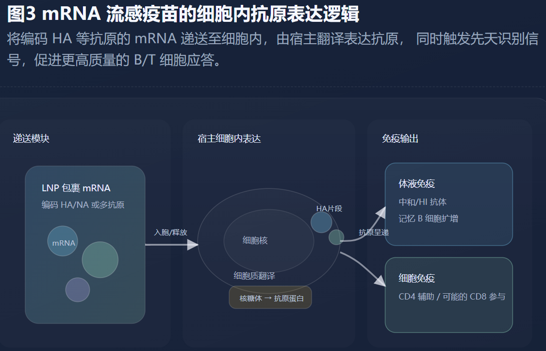 传统季节性疫苗的天花板,归根结底来自“头部HA的变动性”与“评估指标对真实保护维度的简化”。要想突破这一点,广谱疫苗需要同时在抗原设计与免疫诱导方式上升级。抗原设计方面,聚焦HA茎部的免疫原、马赛克/嵌合HA结构、以及将NA与内部蛋白纳入配方的多靶点策略,都在试图把免疫系统的注意力从“最易漂移的区域”引导到“更保守的区域”。免疫诱导方式方面,黏膜递送、合理佐剂组合以及可能的新平台(包括正在探索中的RNA路线)都在争取更平衡的体液-细胞-黏膜联合应答。近年来关于不同平台诱导免疫构型的综述也指出,现有疫苗在细胞免疫上仍有不足,而新平台有望带来更均衡的保护景观。(ScienceDirect)