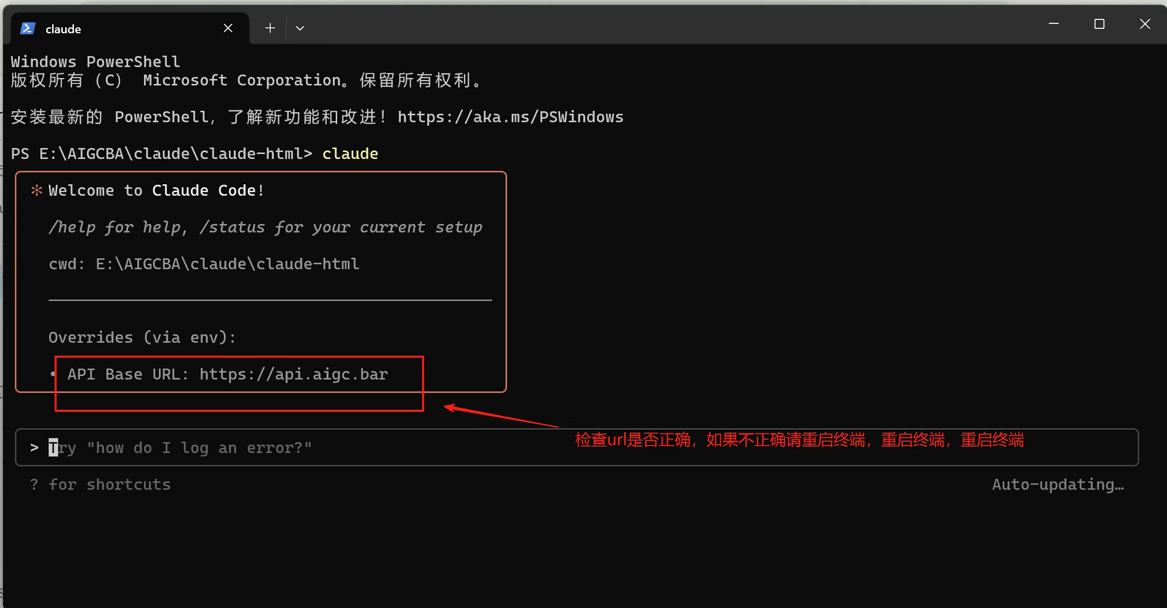 环境变量检查:确认BASE_URL设置为api.aigc.bar,并验证环境变量配置成功(Windows用户需要重启终端)。