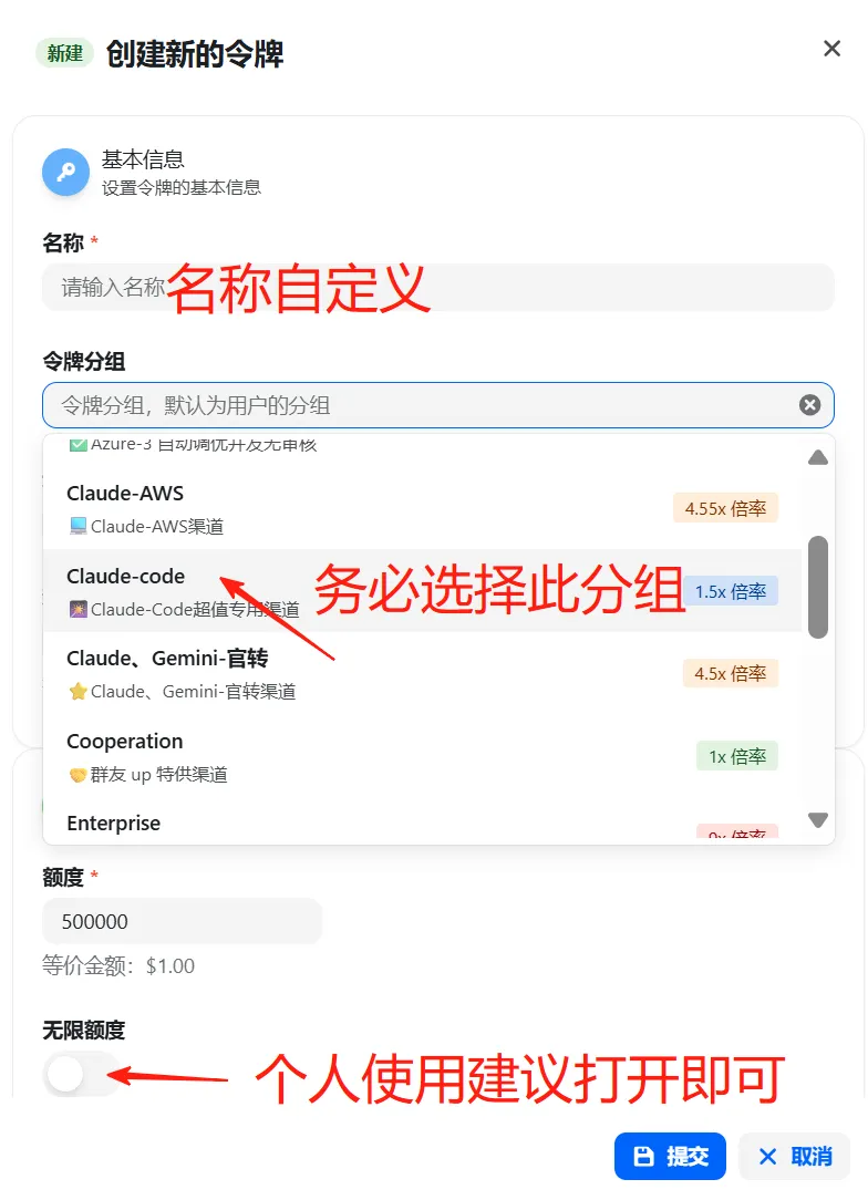 3.令牌分组请选择:claudecode官转分组(务必选择此分组,否则无法使用)