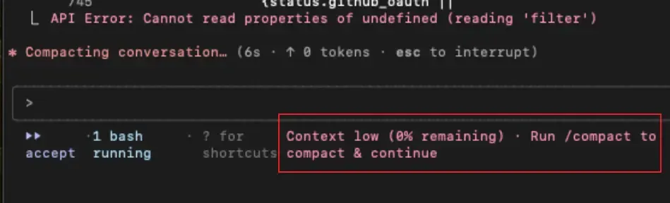 上下文管理:遇到API返回400错误或reading 'filter'错误时,请使用/compact命令压缩上下文或开启新对话,这通常是因为上下文超过了Claude允许的最大上下文200K。